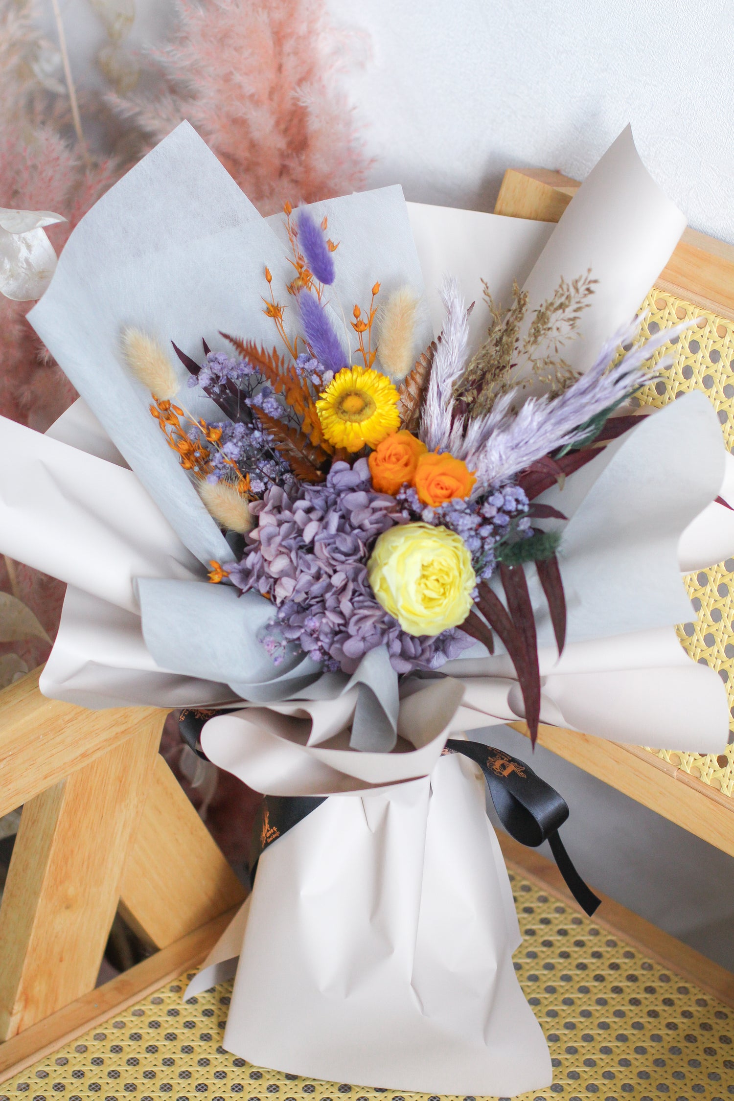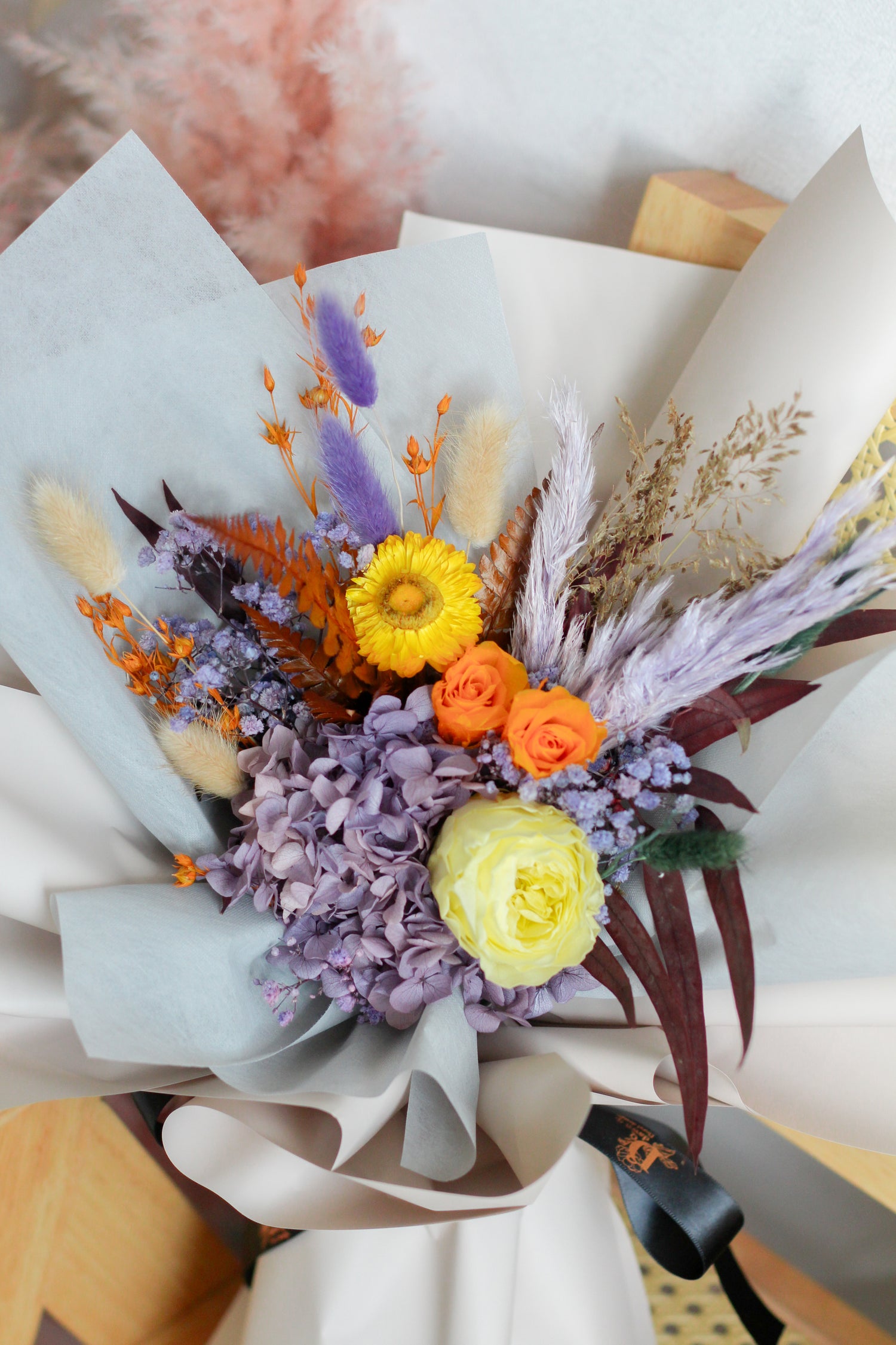 Lemon Lilac Harmony is a stunning combination of pale yellow preserved garden rose and lilac hydrangea. This beautiful pairing creates a cheerful and colourful arrangement that will brighten up any space. Perfect for adding a touch of nature's beauty to your home or gifting to a loved one.