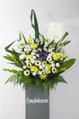 Our sympathy stand is a beautiful way to show your support and compassion. The white gerbera spider, green chrysanthemum, purple cabbage, white ping pong chrysanthemums, and bird nest fern add a touch of elegance to the arrangement. Our white matthiola gives off a sweet fragrance that is sure to comfort the bereaved during this difficult time.