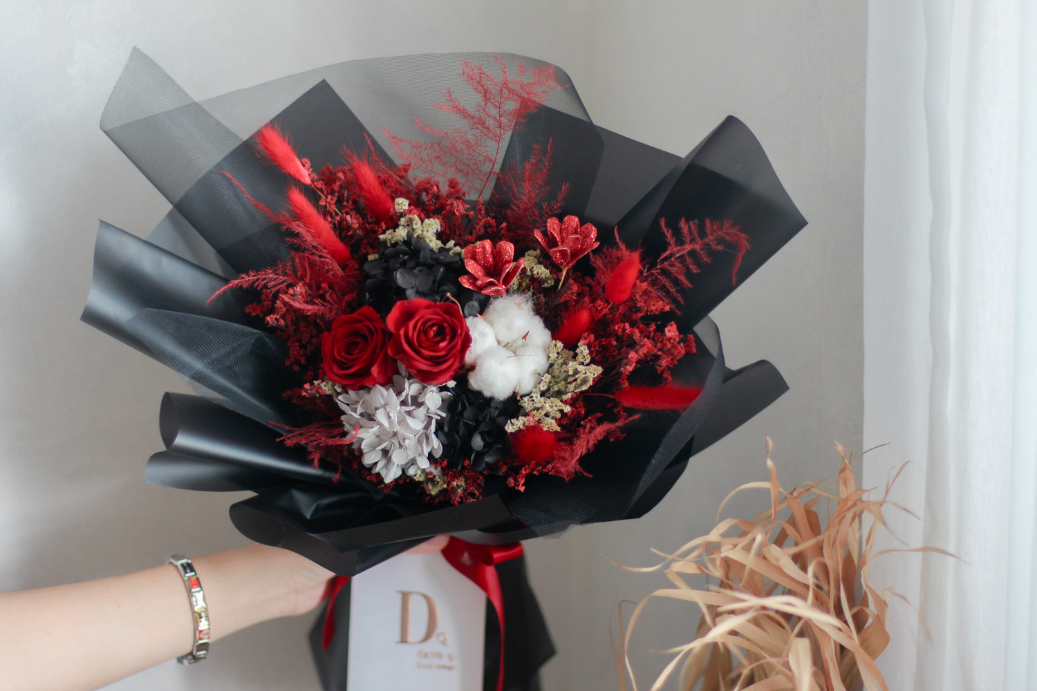 The preserved red roses symbolise passion, devotion, and a promise that endures — retaining their beauty for months with minimal care. Wrapped in dramatic black layers with striking red accents, this bouquet is designed for those who love boldly and without restraint.